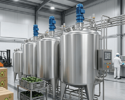 Jacketed heating tanks for avocado processing. Controlled heating & mixing solutions for avocado oil and pulp production.